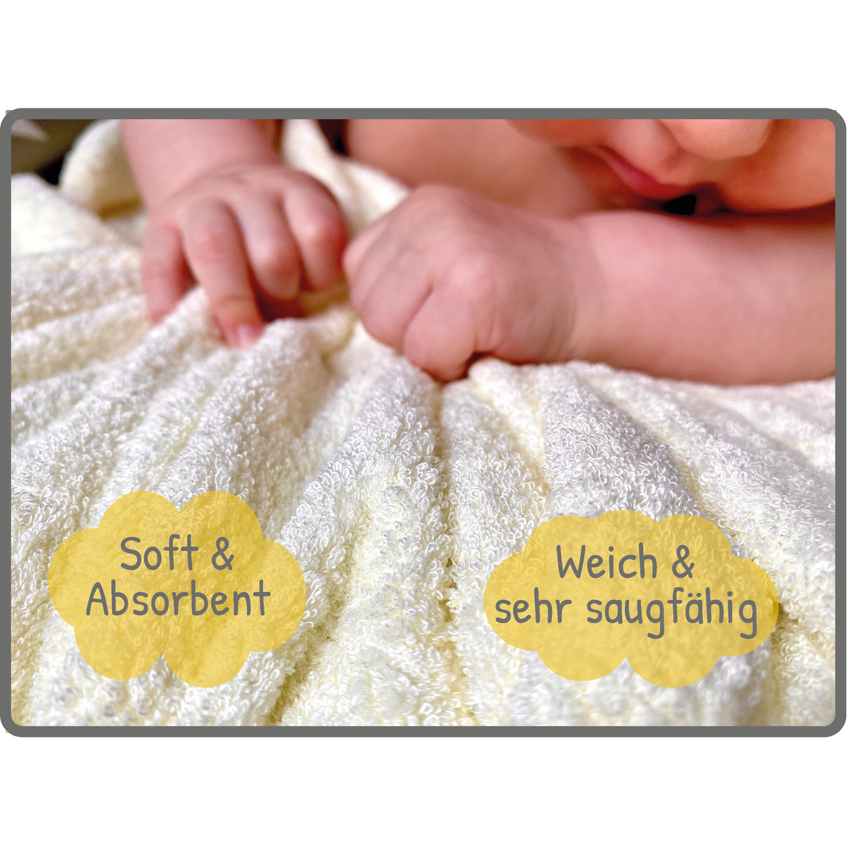 Posebno nježan i upijajući ručnik od 100% pamuka grije i umiruje bebu nakon kupanja, stvarajući osjećaj sigurnosti i udobnosti.
