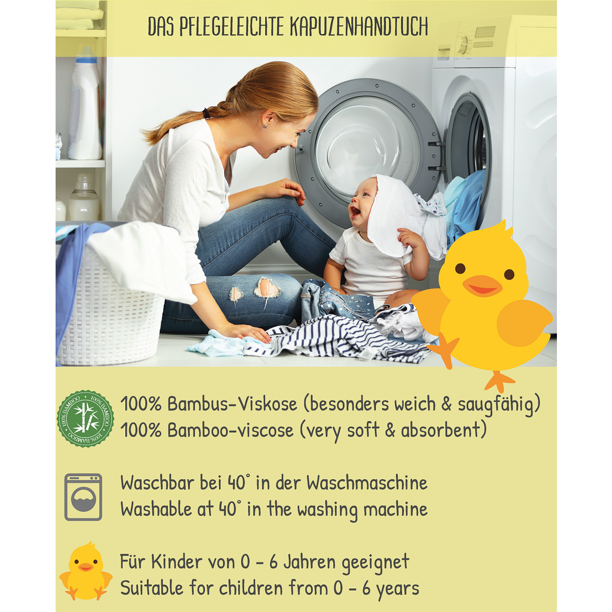 Veliki ručnik s kapuljačom i pripadajuće krpice perivi su na 40 °C — savršeno za svakodnevnu upotrebu u svakoj obitelji.