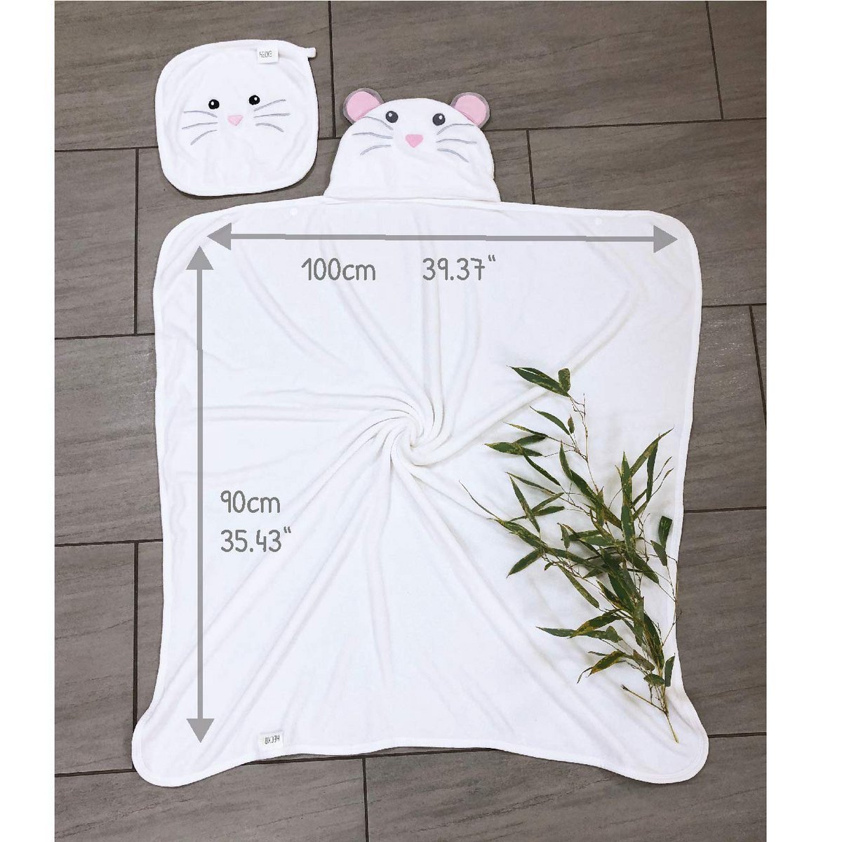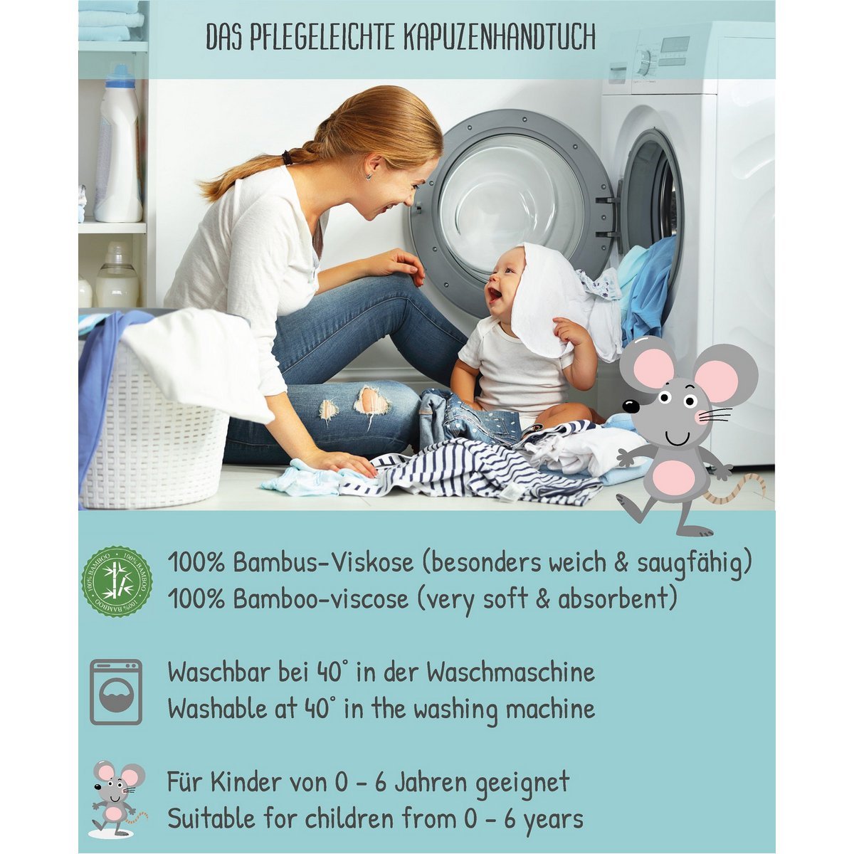 Mekani ručnik s kapuljačom i pripadajućom krpicom od viskoze (bambus) nježno obavija bebu i omogućuje brzo, ugodno sušenje nakon kupanja.