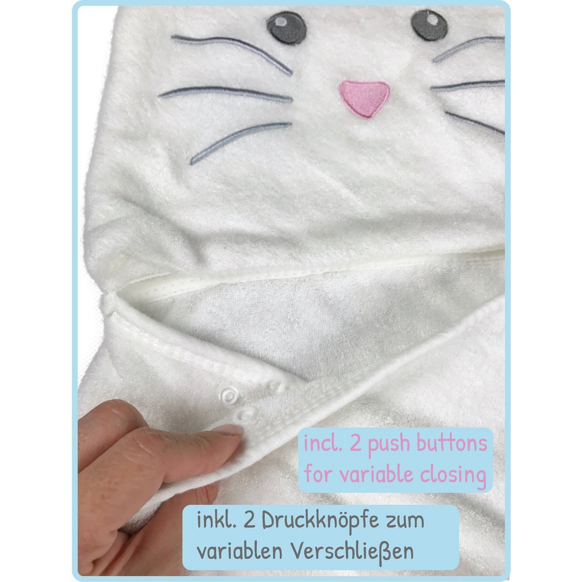 Zahvaljujući dvama praktičnim drukerima, ručnik se lako prilagođava veličini djeteta i ostaje na mjestu tijekom igre ili presvlačenja — toplina i zaštita u svakom trenutku.