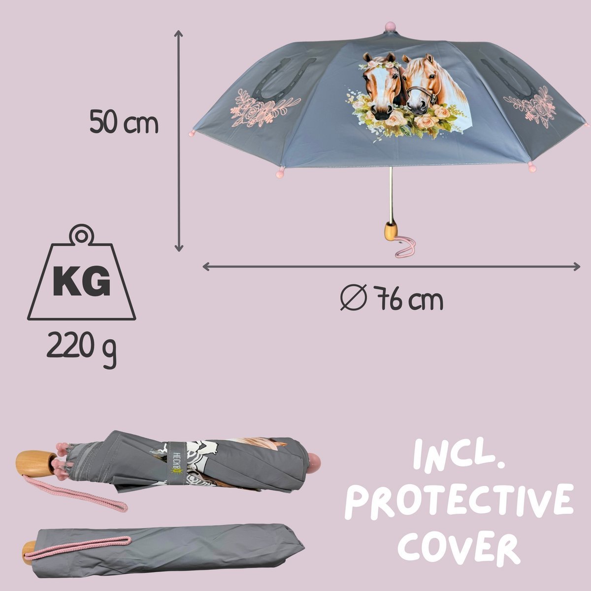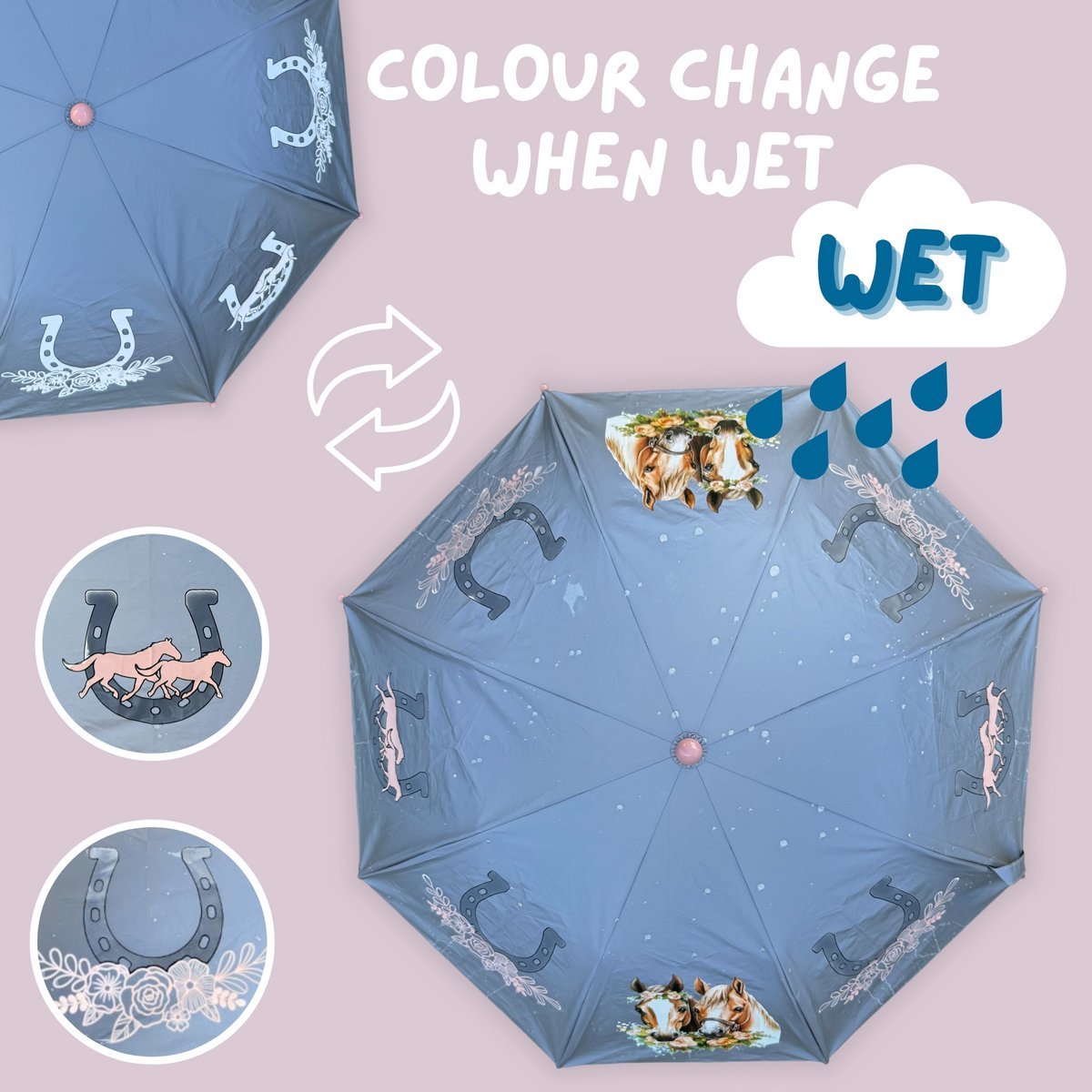 Pravi hit za oblačne dane – čim počne padati kiša, bijeli konji i cvjetovi na kišobranu pretvaraju se u nježno ružičaste tonove. Ovaj očaravajući efekt boje razveselit će svako dijete i pretvoriti sive, kišne dane u male pustolovine.