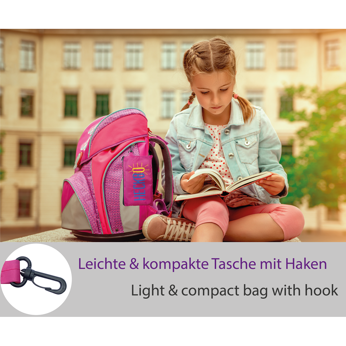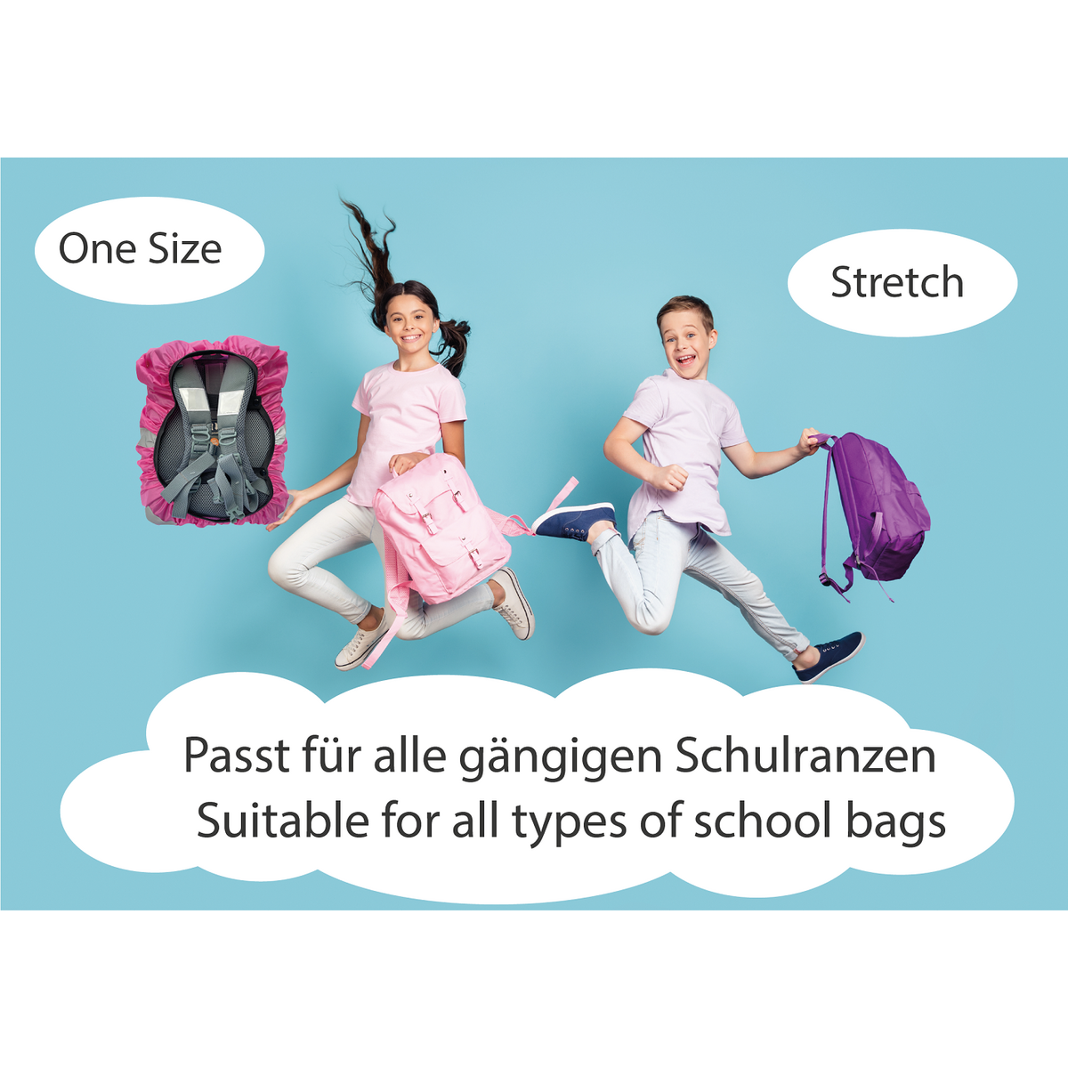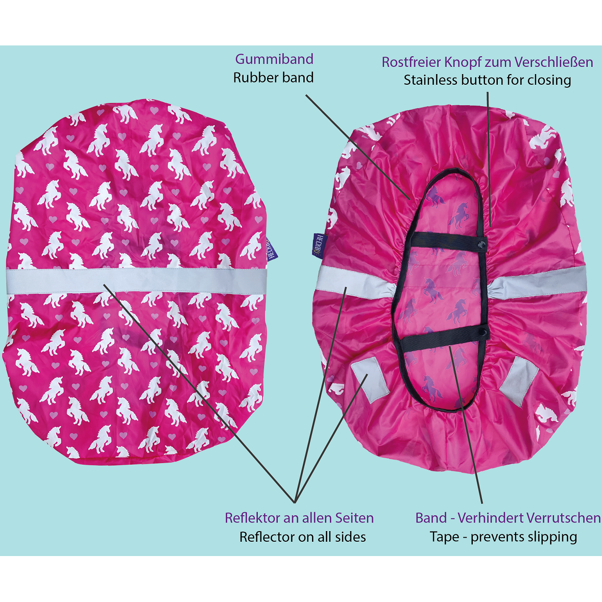 Navlaka se brzo stavlja, a elastične trake osiguravaju čvrsto prianjanje. Prikladna je za većinu školskih torbi i dječjih ruksaka.