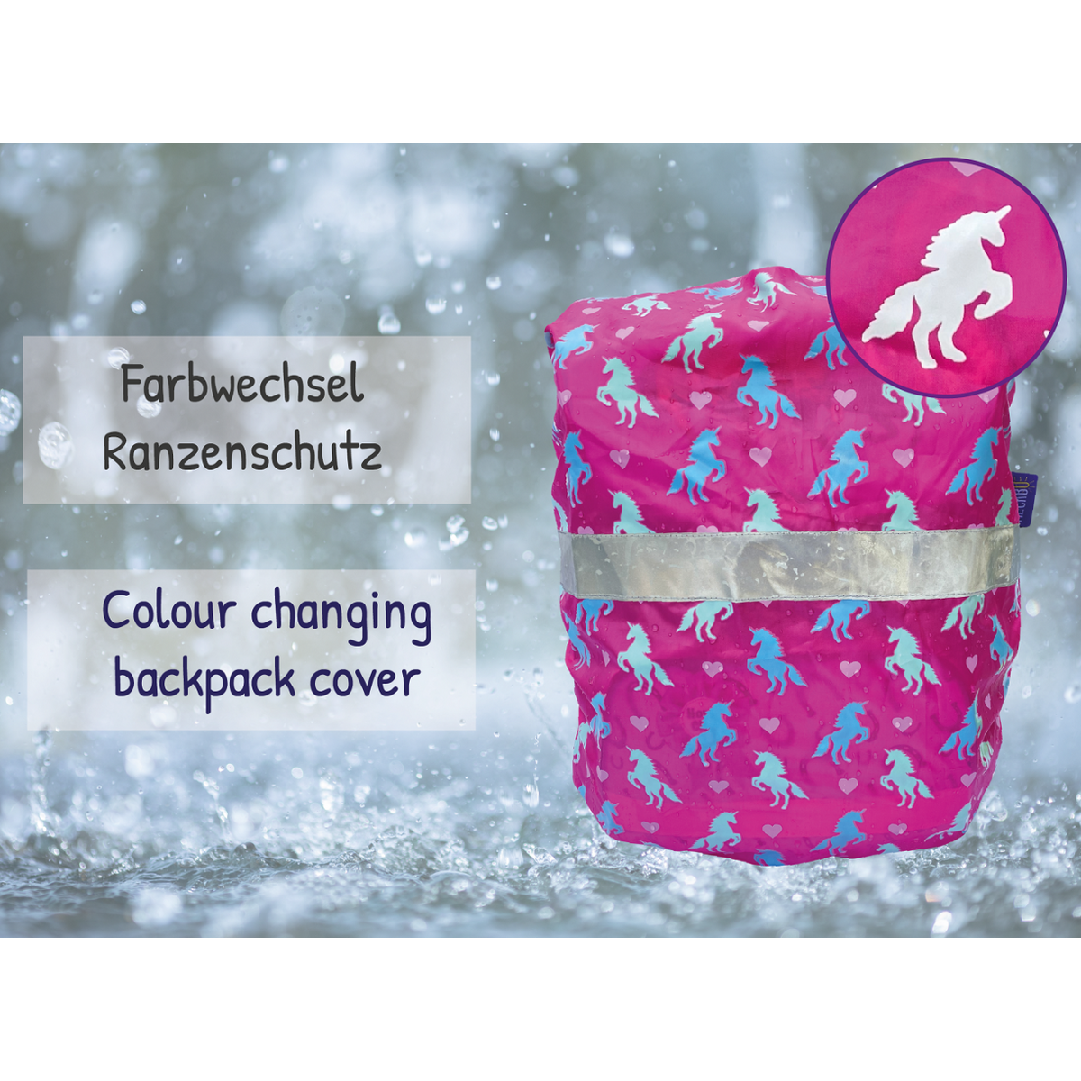 Kad se navlaže, bijeli jednorog pretvara se u živopisne plave i tirkizne tonove — efekt koji svaki put iznova oduševi djecu na putu do škole.