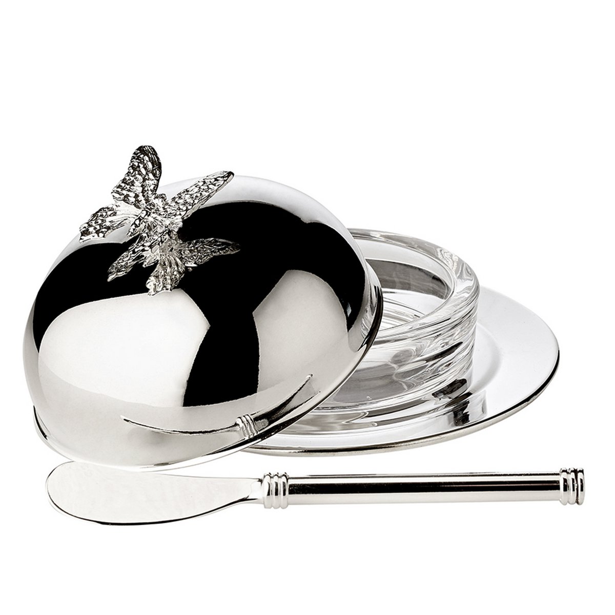 EDZARD Butter bell Butterfly sadrži staklenu zdjelicu i poklopac elegantno posrebren, promjera 14 cm, i savršena je za pohranu maslaca. Ova stilizirana posrebrena zdjelica nije samo praktična, već i efektan detalj na svakom stolu. Bilo da se radi o cijelom komadu maslaca ili manjim porcijama, EDZARD zdjelice su neizostavan dio svake kuhinje i kućanstva.