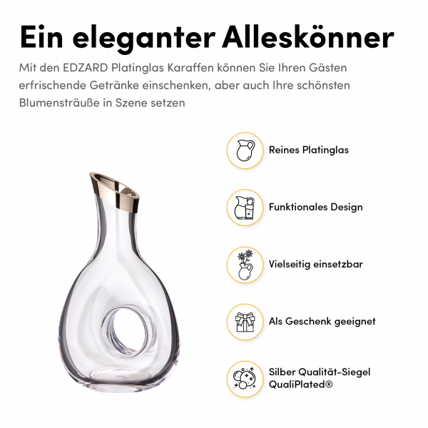 Poseban dojam daje platinasti rub, koji dekanteru dodaje sofisticiran i ekskluzivan izgled. Zahvaljujući pažljivo oblikovanom dizajnu, piće u dekanteru dolazi do izražaja, dok istovremeno služi kao dekorativni element u interijeru.