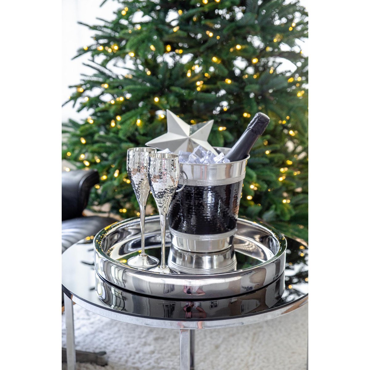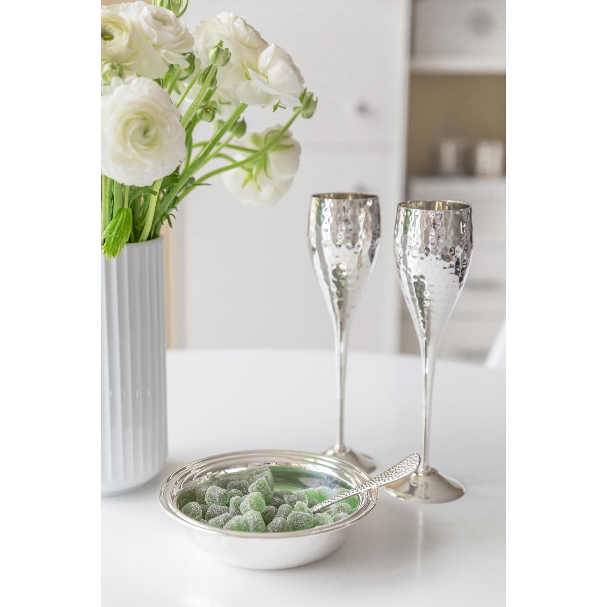 Unesi dozu elegancije i luksuza u svaku proslavu uz EDZARD Dodo šampanj čaše – sofisticiran set od dvije čaše izrađene od ručno obrađenog, posrebrenog metala s karakterističnim “hammered” uzorkom koji svjetlost reflektira u tisuću sitnih odsjaja. Savršene su za svečane trenutke, bilo da nazdravljaš šampanjcem, prosekom ili pjenušcem.