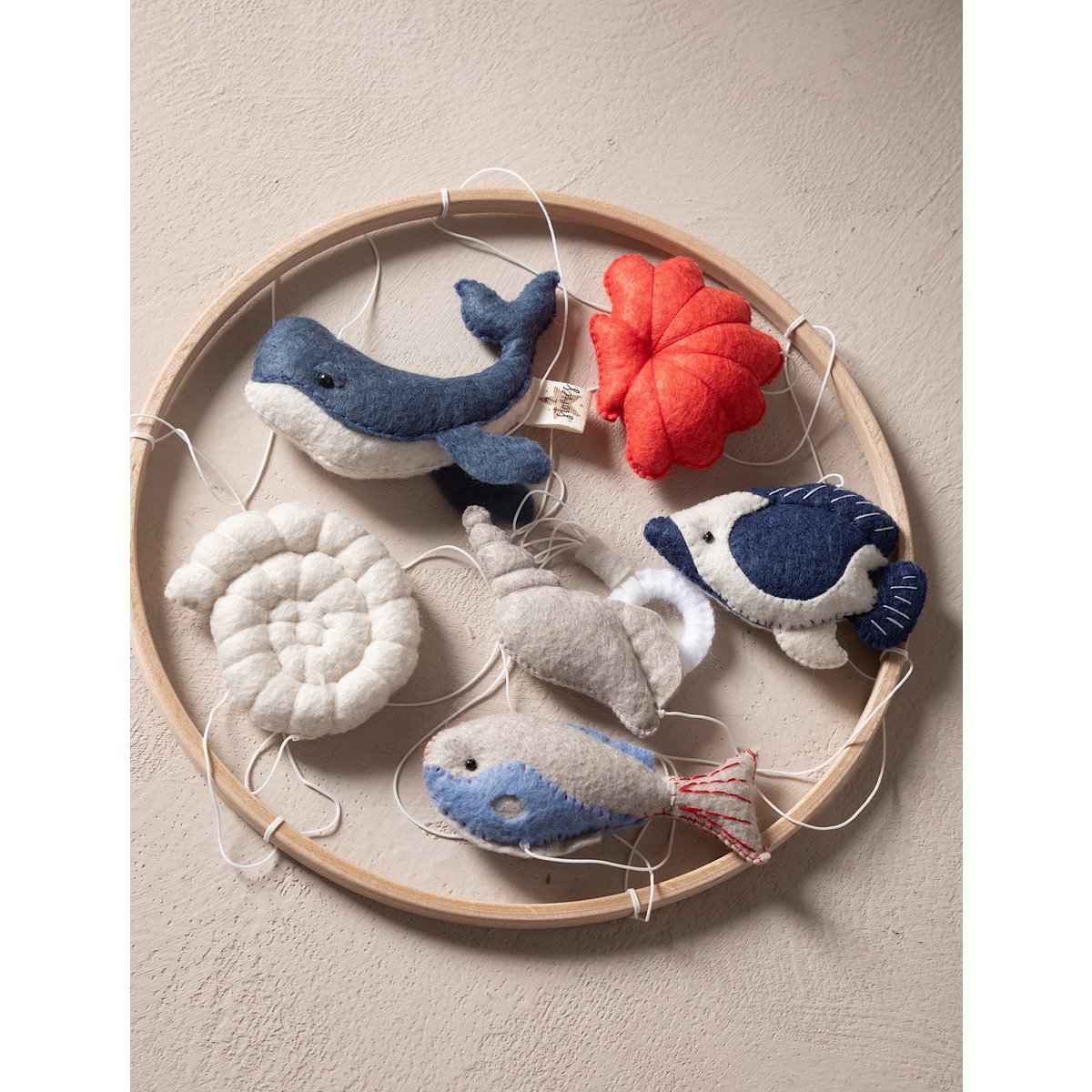 Prekrasni Baby Mobile – Pomorski motiv je ručno izrađena viseća dekoracija za bebe s prikazom morske teme. Mobil je obješen na drveni okvir, s kojeg na bijelim nitima visi pet mekanih, filcanih figura i oblika. Među njima su plavi kit, narančasta ribica, svijetlosiva školjka, spiralna krem školjka i plavo-bijela ptica. Svaka figura je pažljivo ušivena i ispunjena mekanim punjenjem, što im daje nježan i bajkovit izgled.