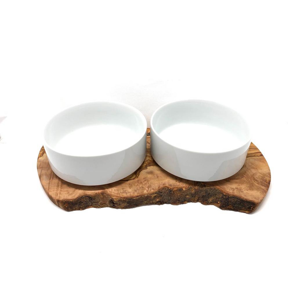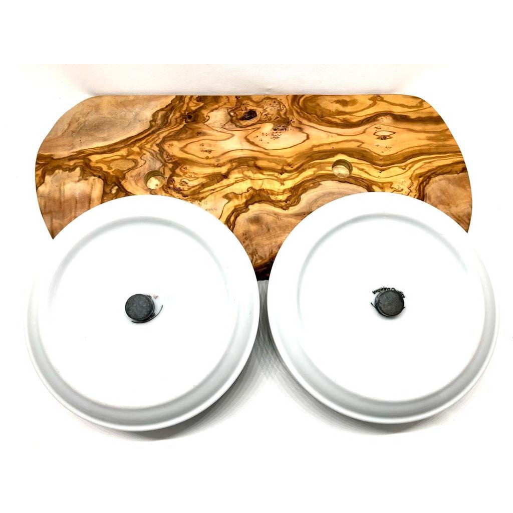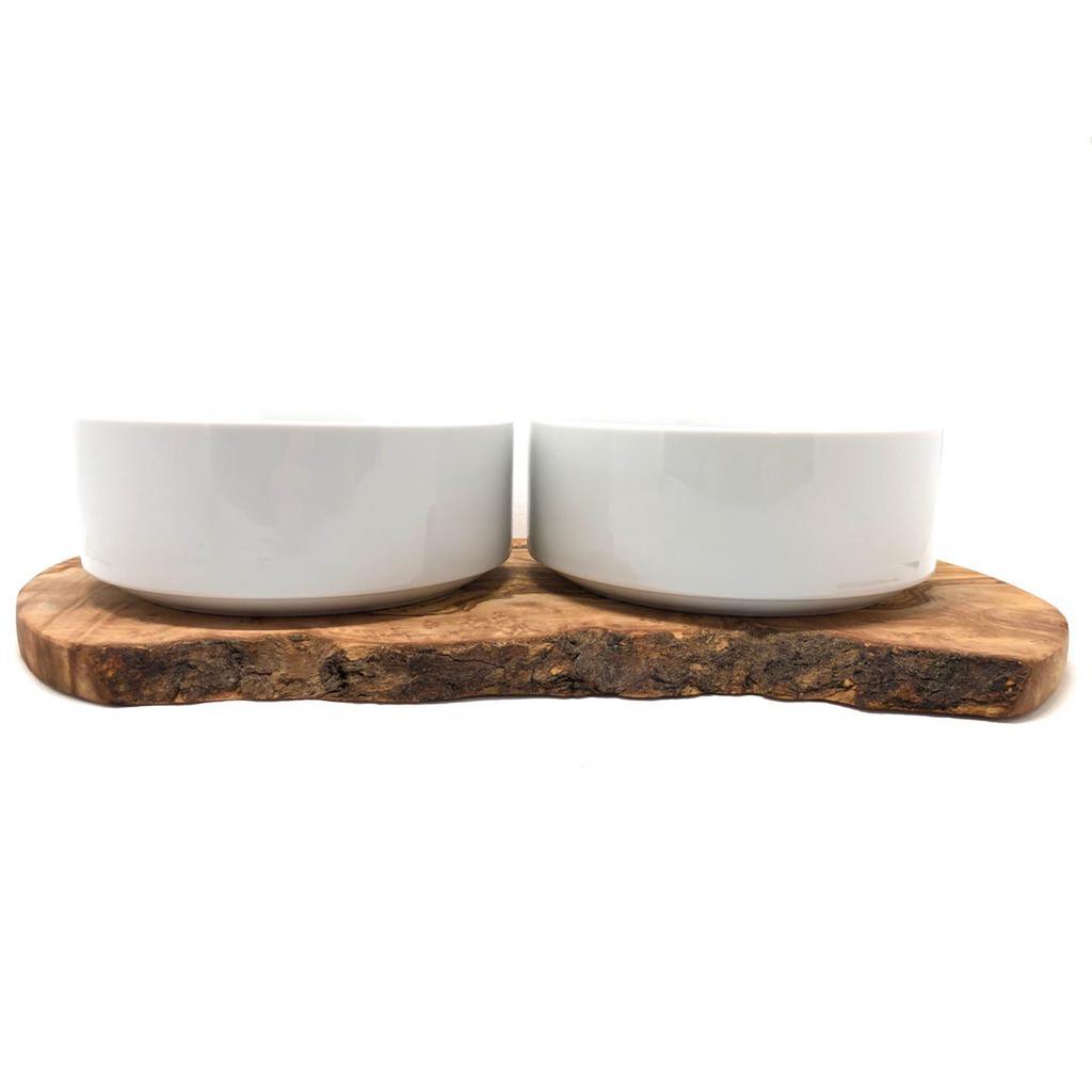 Feeding station for large dogs. The two porcelain bowls for dry and wet food (1.5 liters each, approx. Ø 18 cm) are fixed on a solid olive wood base. The dog cannot detach the bowls from the base when eating. For the purpose of cleaning, the bowls can of course be easily lifted off the base by humans. The base is approx. 40 – 45 cm long and approx. 15 cm wide. 100% natural! We have completely dispensed with the use of artificial wood protection. The wood is permanently protected against dirt and moisture by multiple treatments with olive oil. On the underside there are anti-slip pads for a secure stand, so that the entire feeding station cannot “wander” while eating.