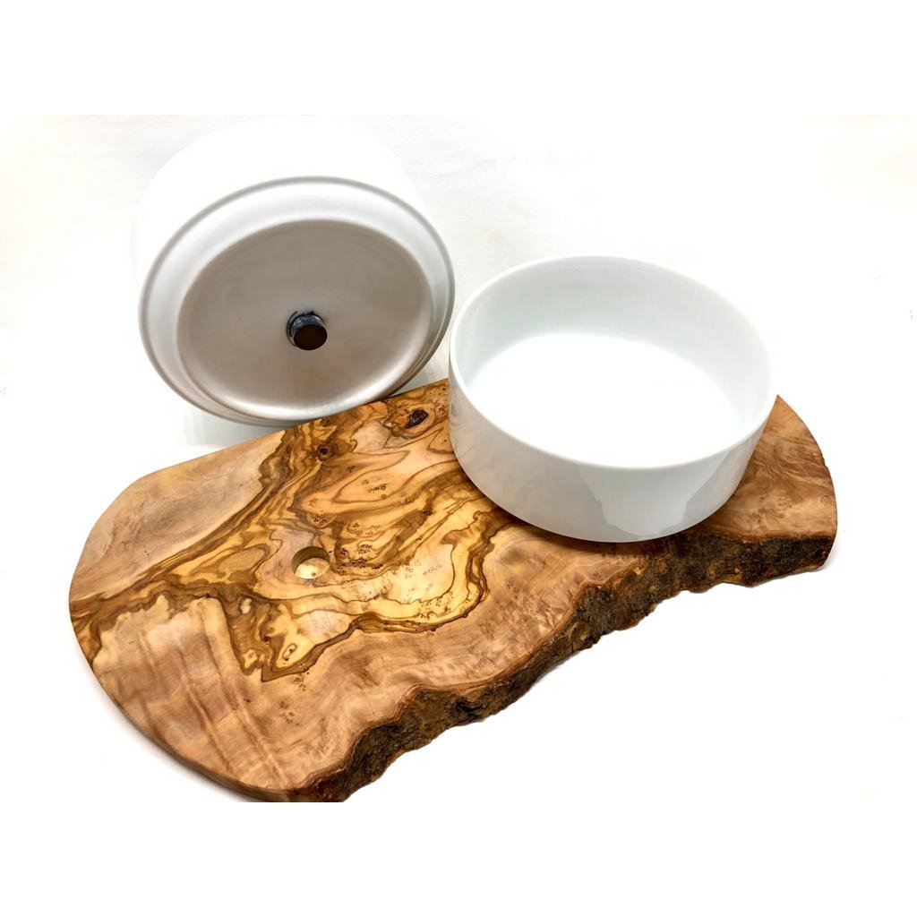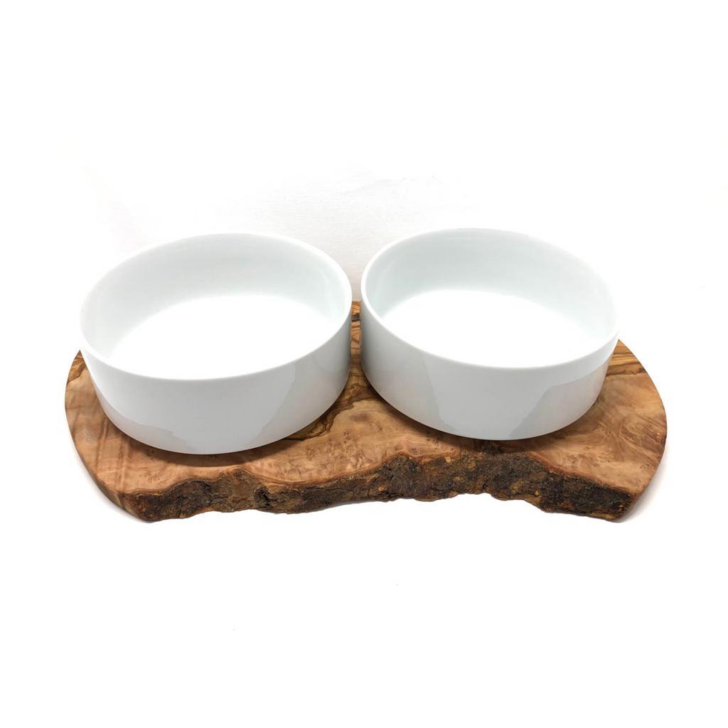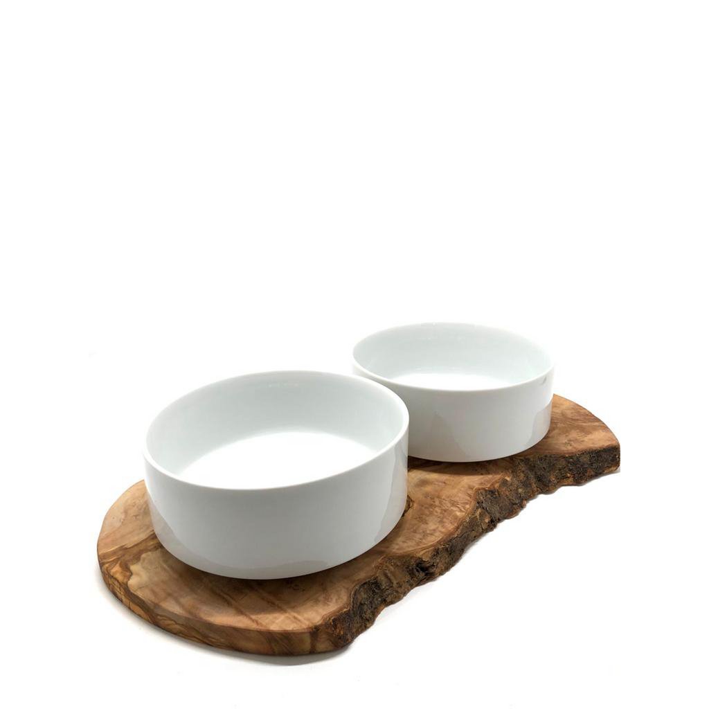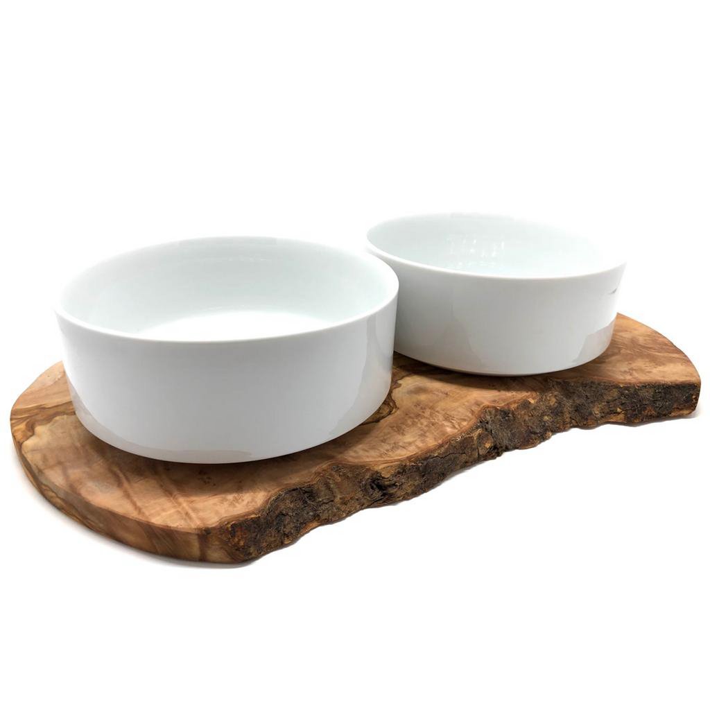 Feeding station for large dogs. The two porcelain bowls for dry and wet food (1.5 liters each, approx. Ø 18 cm) are fixed on a solid olive wood base. The dog cannot detach the bowls from the base when eating. For the purpose of cleaning, the bowls can of course be easily lifted off the base by humans. The base is approx. 40 – 45 cm long and approx. 15 cm wide. 100% natural! We have completely dispensed with the use of artificial wood protection. The wood is permanently protected against dirt and moisture by multiple treatments with olive oil. On the underside there are anti-slip pads for a secure stand, so that the entire feeding station cannot “wander” while eating.
