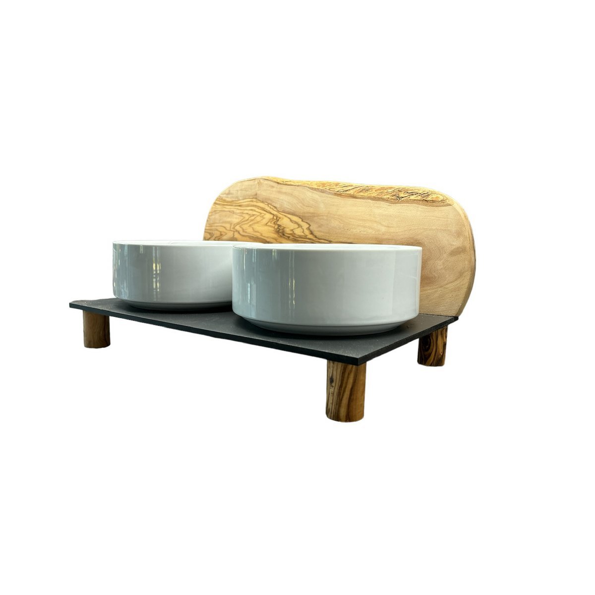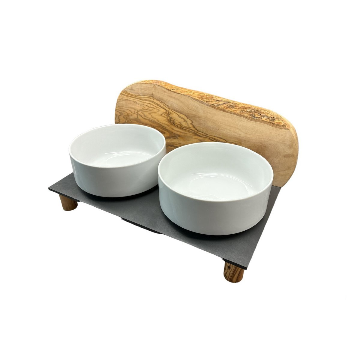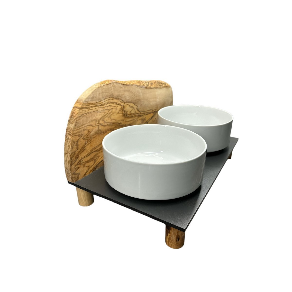 Für den anspruchsvollen Hund! Zwei weiße Porzellanschalen je 0,9 Liter als Futternapf, auf einer schwarzen, extrem unempfindlichen Platte (40 x 20 cm). Der Clou: Als Spritzschutz ist ein rustikal massives Brett aus Olivenholz fixiert. Durch den natürlich rustikalen Rand ähnelt es in dieser Kombination einem Berg. Antirutsch-Füße sorgen für sicheren Stand. Zudem ist die gesamte Futterstation erhöht (siehe unterschiedliche Höhen).
