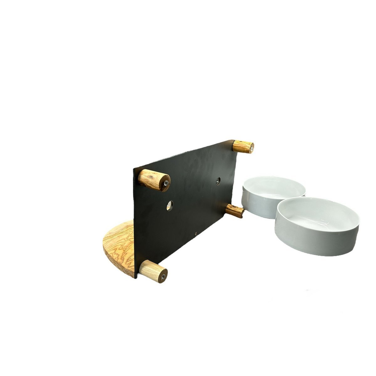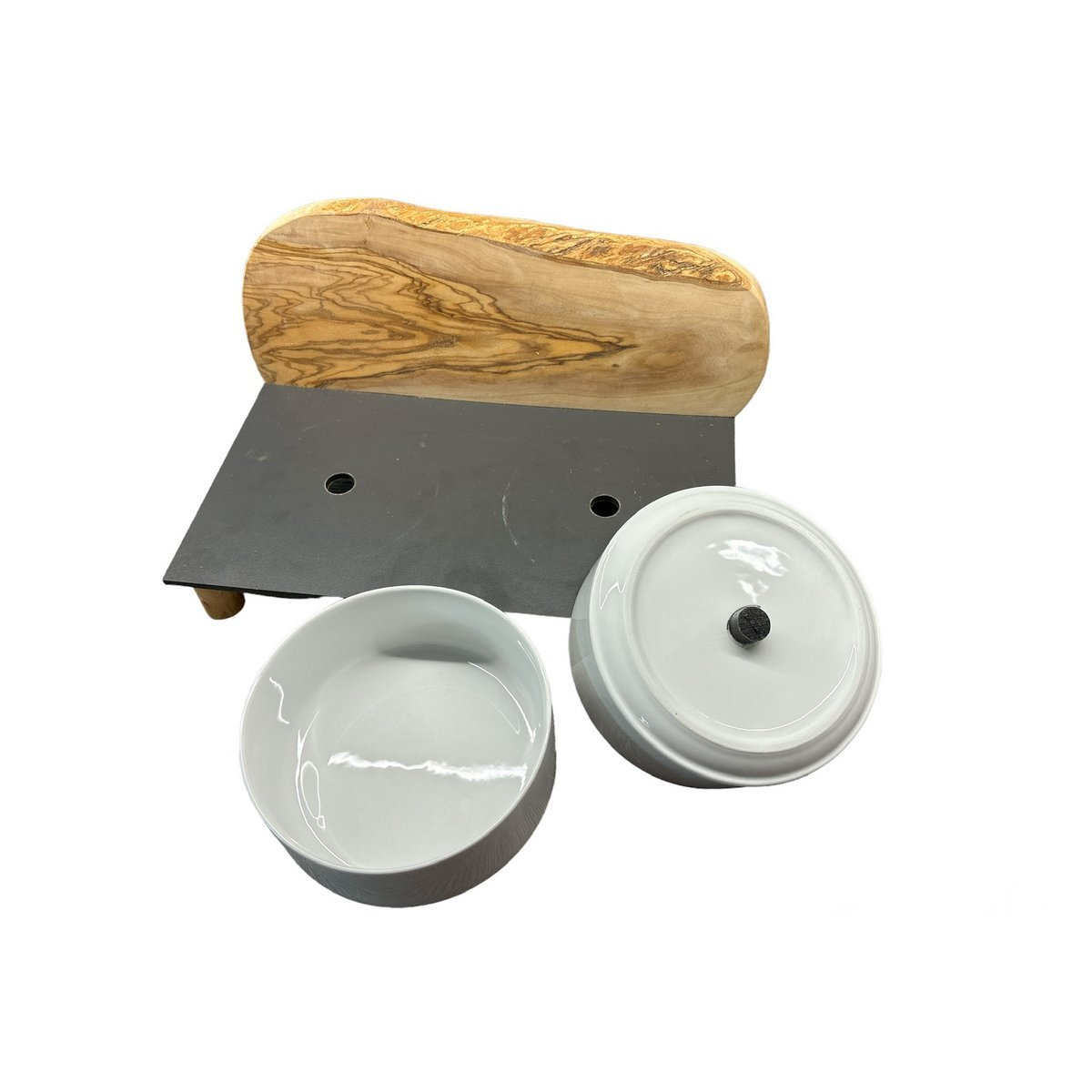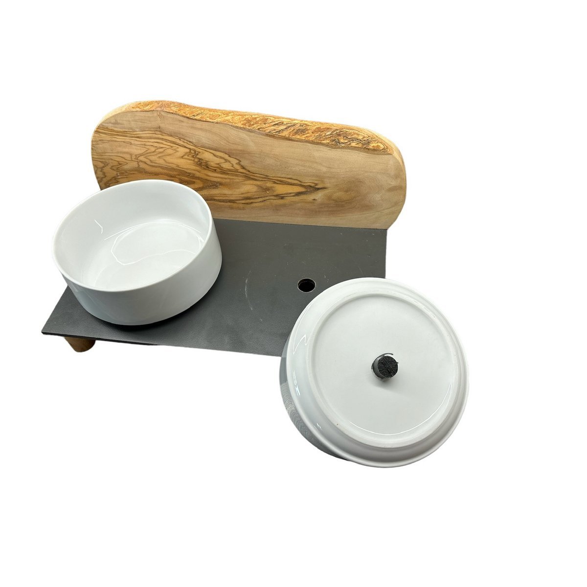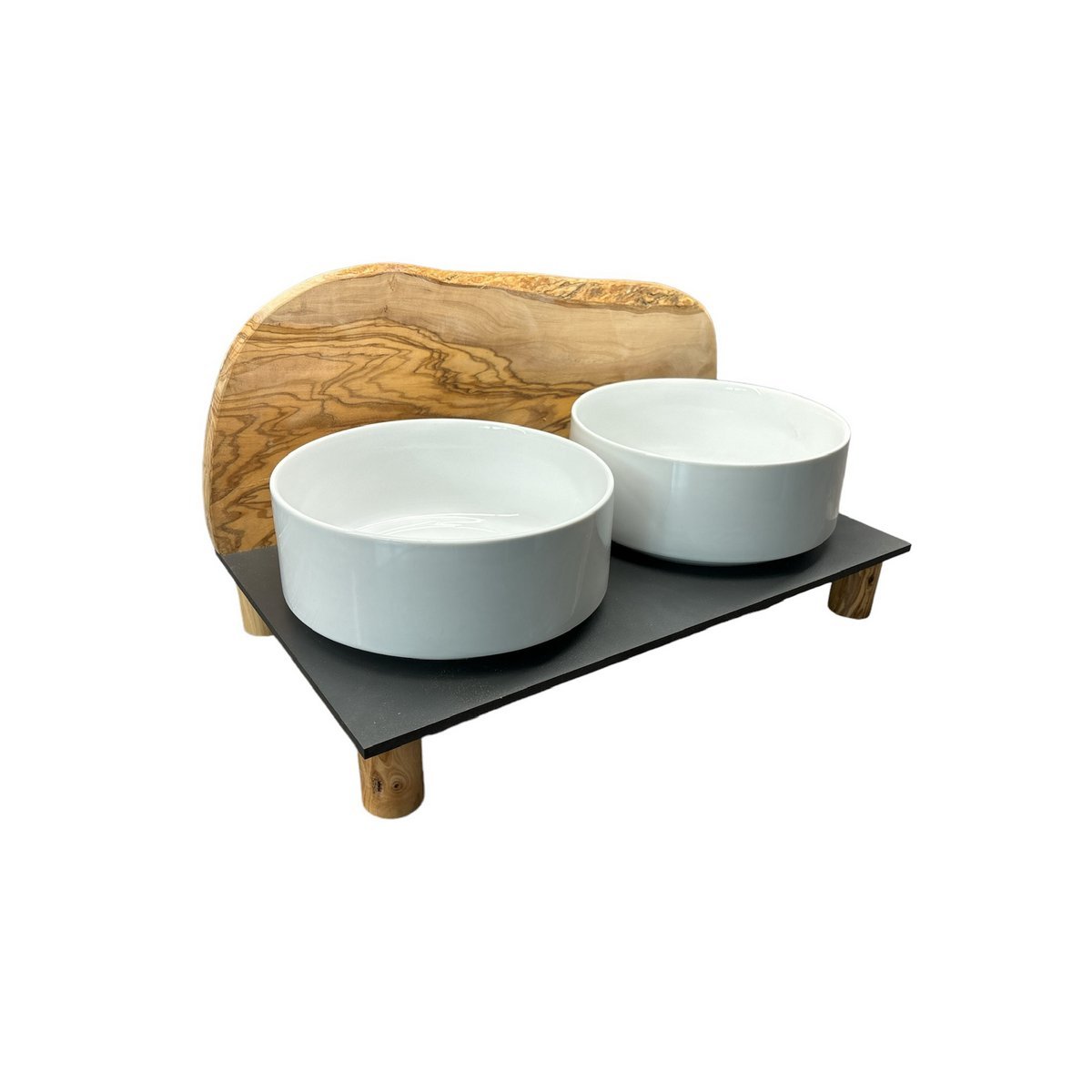 Für den anspruchsvollen Hund! Zwei weiße Porzellanschalen je 0,9 Liter als Futternapf, auf einer schwarzen, extrem unempfindlichen Platte (40 x 20 cm). Der Clou: Als Spritzschutz ist ein rustikal massives Brett aus Olivenholz fixiert. Durch den natürlich rustikalen Rand ähnelt es in dieser Kombination einem Berg. Antirutsch-Füße sorgen für sicheren Stand. Zudem ist die gesamte Futterstation erhöht (siehe unterschiedliche Höhen).