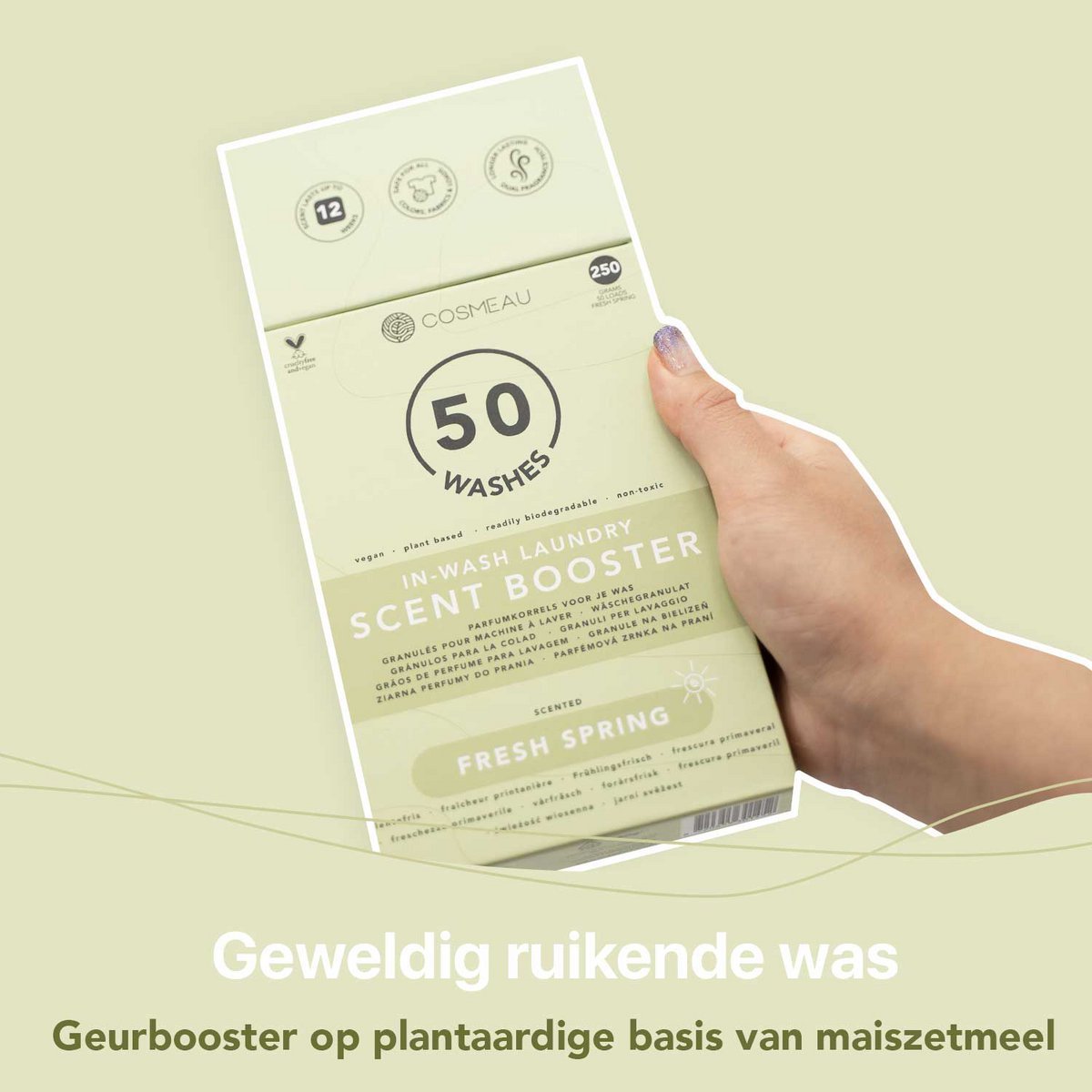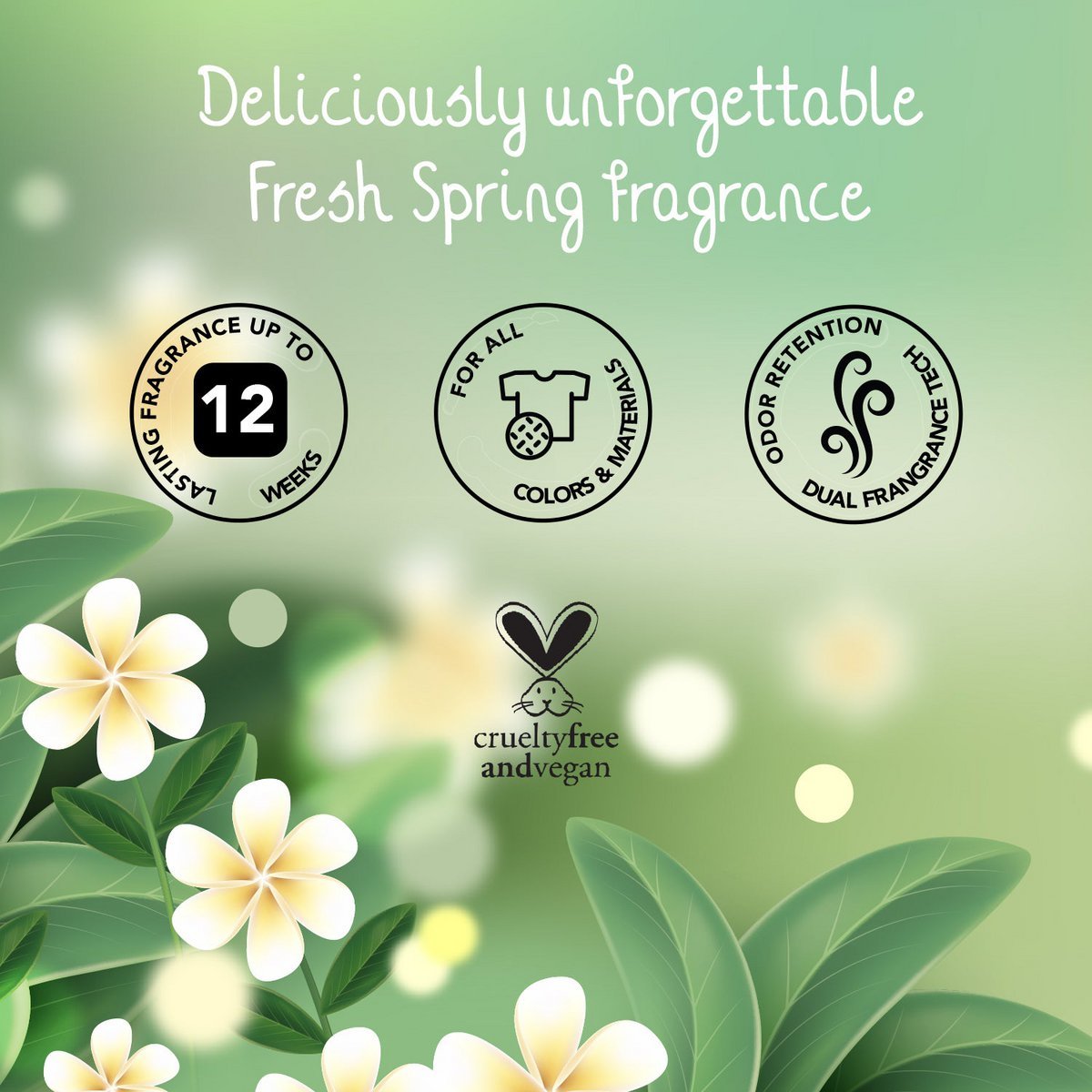Miris Fresh Spring je jedinstveno razvijen miris temeljen na svježim elementima naših listića za pranje rublja. Miris pojačivača je dugotrajan i baziran na različitom proljetnom cvijeću. Miris cijene i muškarci i žene te nije pretjerano sladak niti cvjetan.