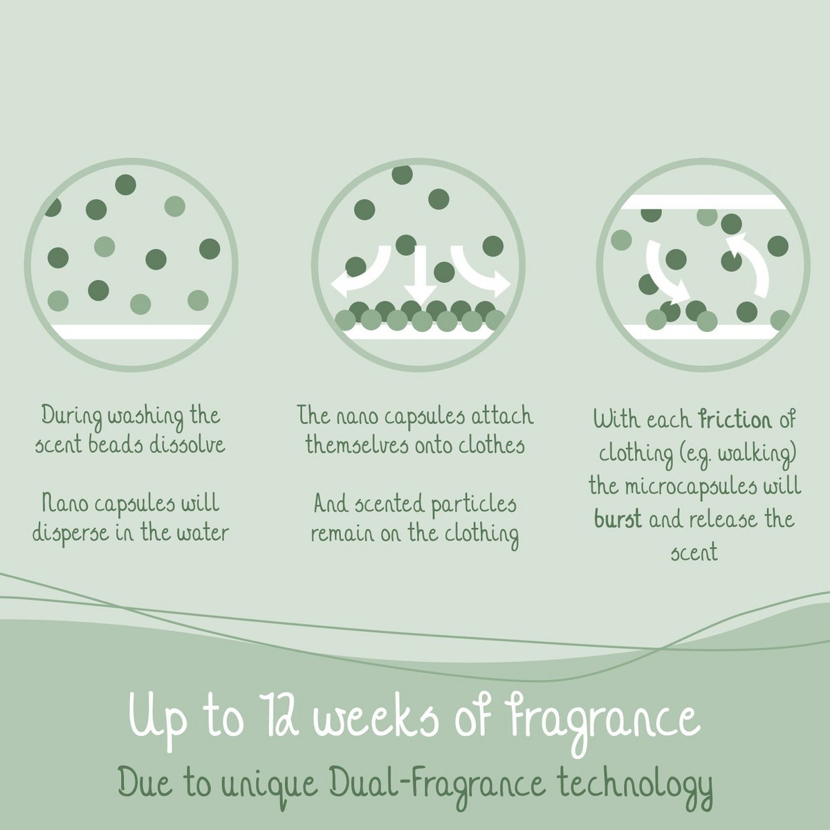 Ekološki prihvatljiv pojačivač mirisa s nezaboravnim svježim mirisom! Do 12 tjedana mirisa zahvaljujući tehnologiji dvostrukog mirisa kod koje zadržane mikrokapsule mirisa pucaju tijekom trenja odjeće. Na primjer, tijekom hodanja i vježbanja.