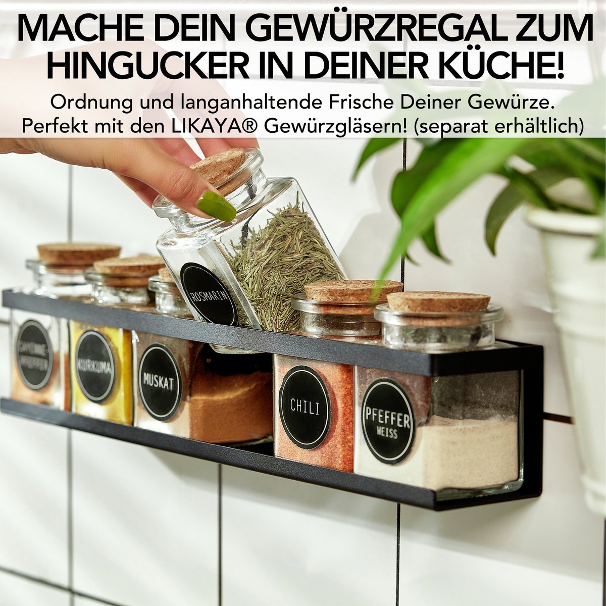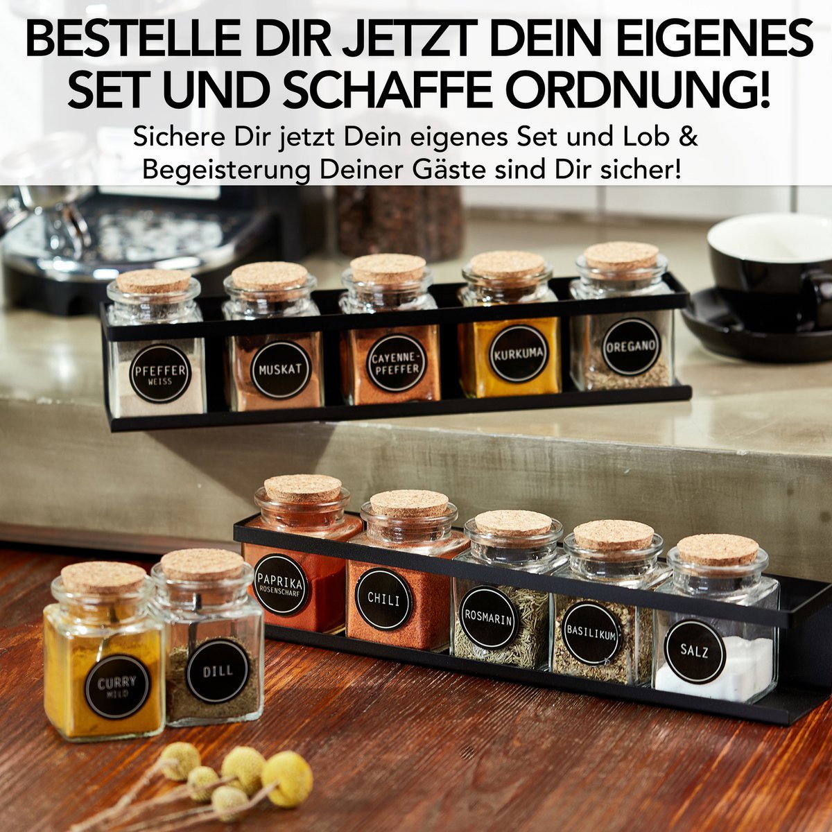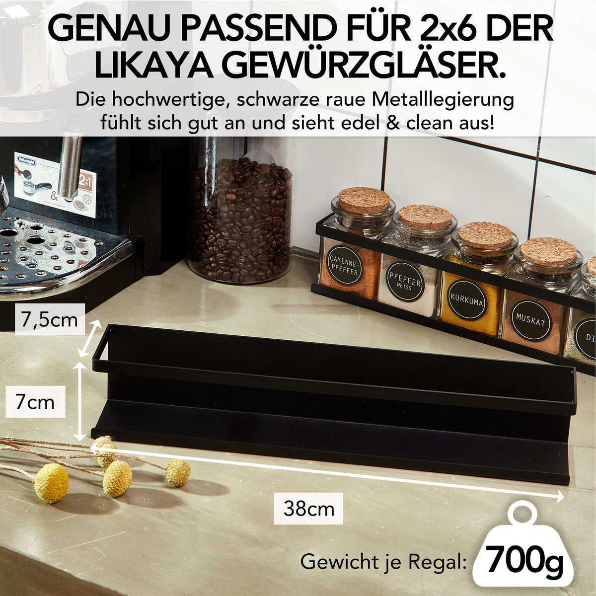 Bring order to your kitchen with the spice shelf (2 Set) made of black metal! Practical and stylish, 6 of our spice glasses fit in each and the labels remain visible. Give your kitchen a touch of elegance and enjoy the function and aesthetics of this must-have. Perfect for home organization enthusiasts!