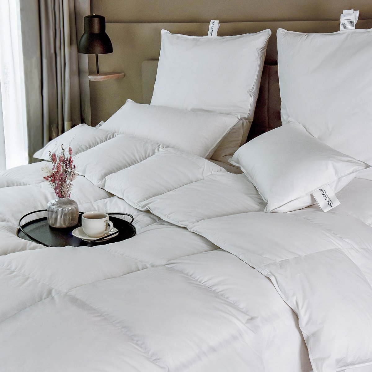 Navlaka je izrađena od 100 % pamuka, a punjenje sadrži bijelo perje klase 1, ukupne težine 1.500 g. Jastuk je 100 % prirodan i održiv, izrađen od obnovljivih sirovina. Downpass certifikat osigurava da je perje prikupljeno uz poštivanje dobrobiti životinja. Certificiran je prema OEKO-TEX Standard 100, što jamči da ne sadrži štetne tvari. Jastuk je jednostavan za održavanje – može se prati na 60 °C i sušiti u sušilici.