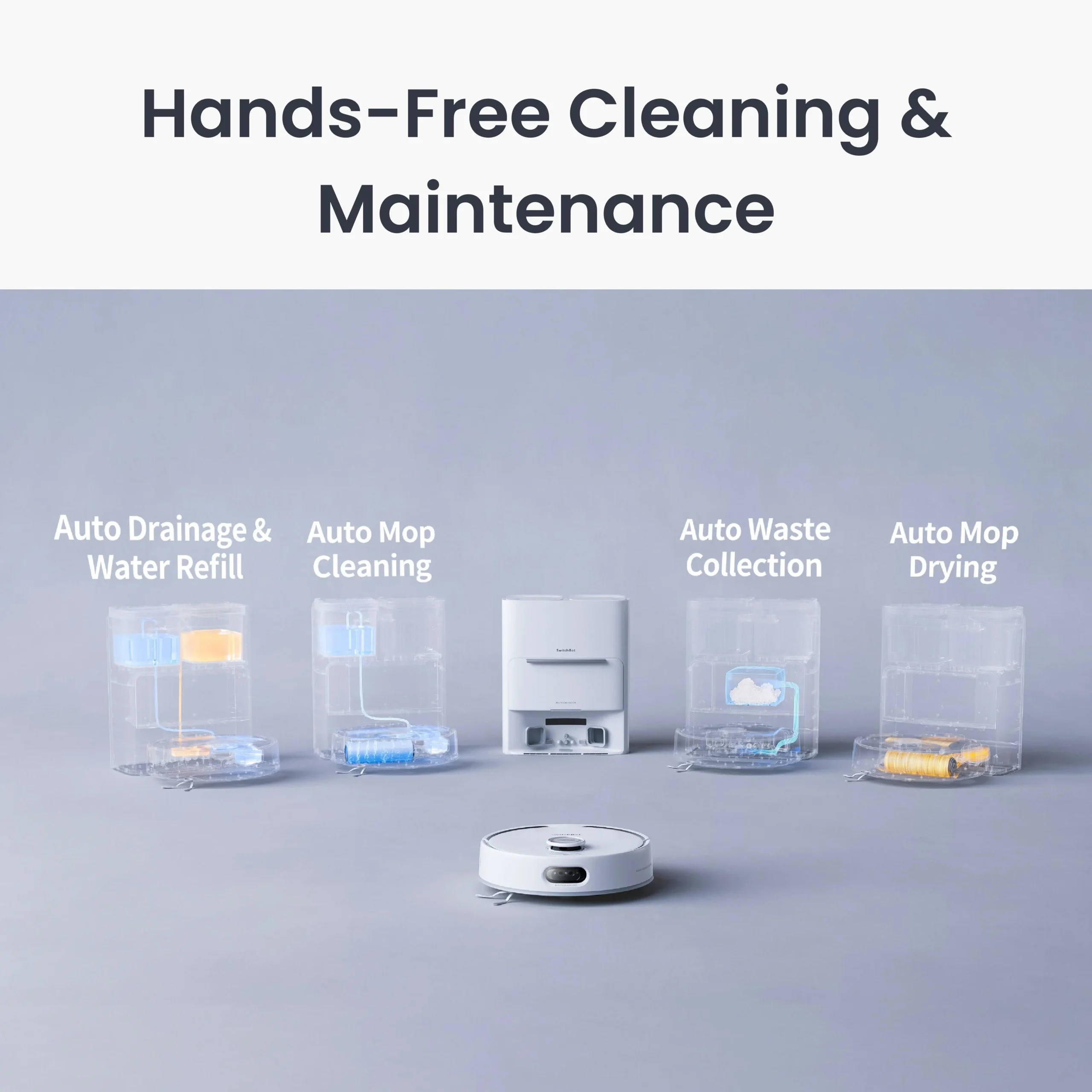 SwitchBot S20 je napredni robotski uređaj koji kombinira usisavanje i pranje podova u jednom, pružajući potpuno automatizirano čišćenje doma. Zahvaljujući pametnoj navigaciji i senzorima, učinkovito mapira prostor i izbjegava prepreke, osiguravajući temeljito čišćenje svih površina. Uređajem se može upravljati putem mobilne aplikacije ili glasovnih asistenata, uz mogućnost postavljanja rasporeda i zona čišćenja. Snažno usisavanje i funkcija mokrog brisanja čine ga idealnim rješenjem za svakodnevno održavanje čistoće uz minimalan trud.